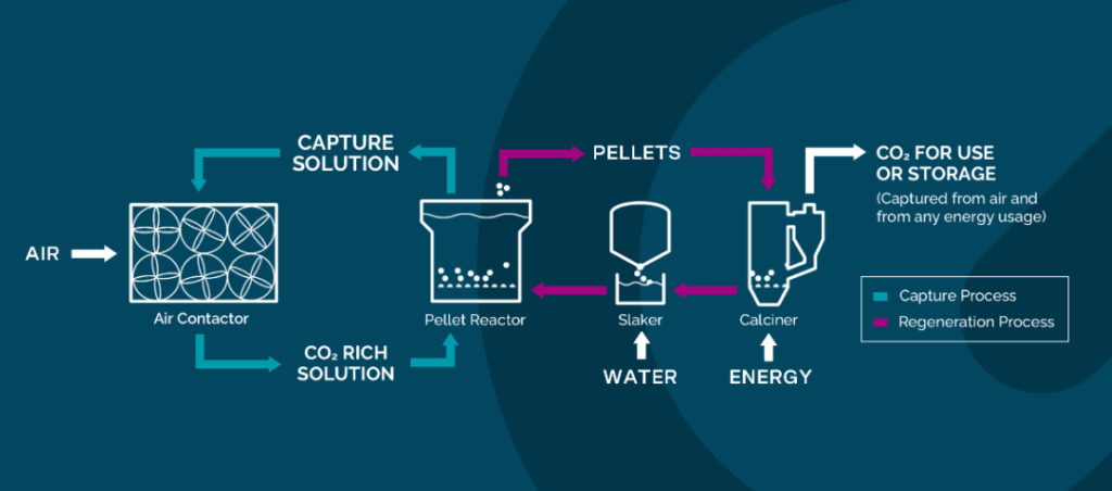 空気中のCO₂を水酸化カリウム(KOH)で液体吸収し、ペレットリアクターで炭酸カルシウム(CaCO₃)を作り、約900℃のカルシナーでCO₂を分離して生石灰(CaO)を再生――という 苛性回収ループ。