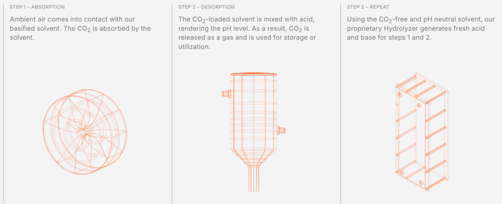 学術的な出発点はMITのFaradaic electro-swing reactive adsorption(Voskian & Hatton, 2019)で、企業としての技術ページや資料でも“電力のみでDAC/排ガス双方に対応”を標榜。