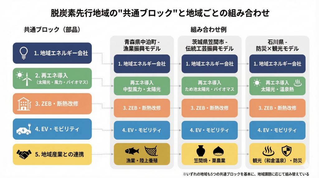 第7回の12件を含め、全102件の計画を見渡すと、構成要素には共通のパターンがある。「地域エネルギー会社+再エネ+ZEB・断熱改修+EV・モビリティ+地域産業」というブロックを、土地の事情に合わせて組み替えているイメージだ。中泊町では漁業、笠間市では陶芸と農業、石川県では防災と温泉というように表の主役は異なるが、裏側のエネルギーと金融の組み方は似ている。