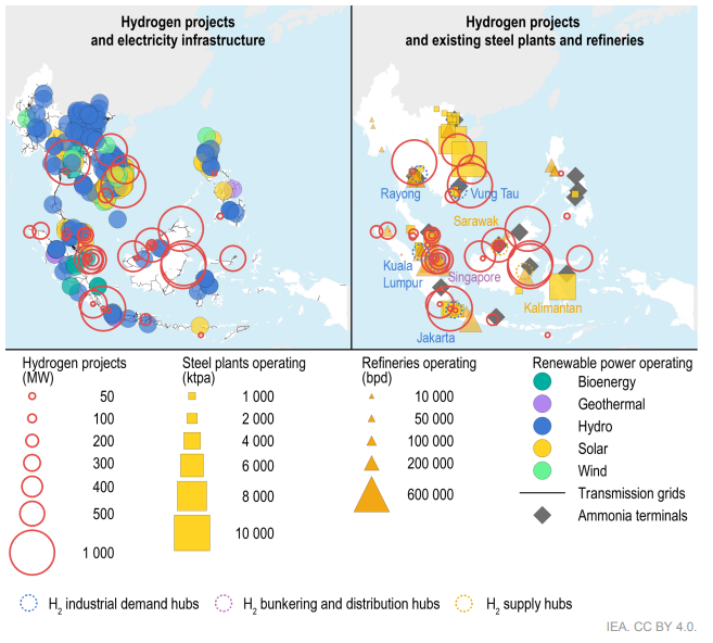 東南アジアは、安価な再エネを活かしたグリーン水素・アンモニアの生産拠点になると同時に、肥料・化学・発電・輸送などでの新たな需要地にもなり得ます。IEAは、再エネ導入拡大と系統増強、特定セクターでのパイロット案件、港湾クラスターの整備を組み合わせることが、域内のバリューチェーン構築の鍵になると整理します。