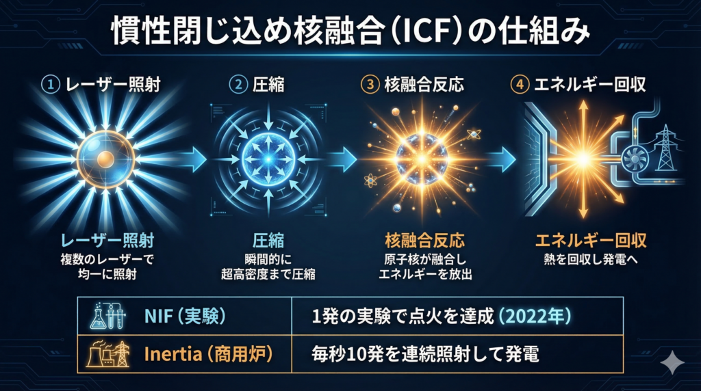 Inertia Enterprisesが手がけるのは、慣性閉じ込め核融合(ICF)と呼ばれる方式だ。ミリメートルサイズの燃料ターゲットに強力なレーザーを照射し、瞬間的に圧縮・加熱して核融合反応を起こす。いわば、小さな燃料カプセルを連続的に「爆縮」させることでエネルギーを取り出すアプローチである。