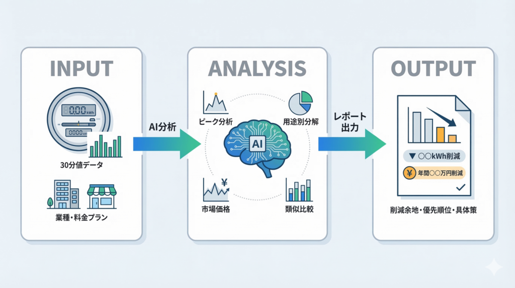 エネマネ診断レポートの流れ:スマートメーターの既存データをAIが分析し、削減余地を金額つきで見える化する