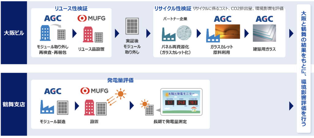 - 協業の一環として、三菱UFJ銀行のビルに後付け型の太陽光ガラスを設置し、リユースとリサイクルを検証します。