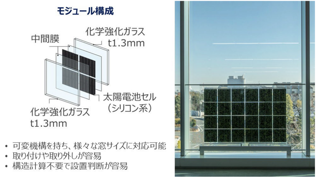 協業の「顔」となるのが、建材一体型太陽光発電ガラス「サンジュール®」の後付けタイプです。これは既存窓の室内側に追加で取り付けられる太陽光ガラスで、採光性を保ちながら発電もできるのが特徴です。屋根にパネルを載せにくい都市部のビルでも、窓を使って再エネを取り込める点がポイントです。