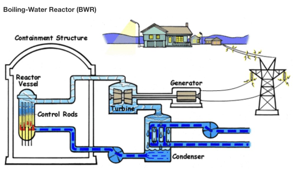- BWR(沸騰水型):炉の水を直接沸騰させ、その蒸気をそのままタービンへ送る(単一ループ)。機器はシンプルだが蒸気の管理が重要。