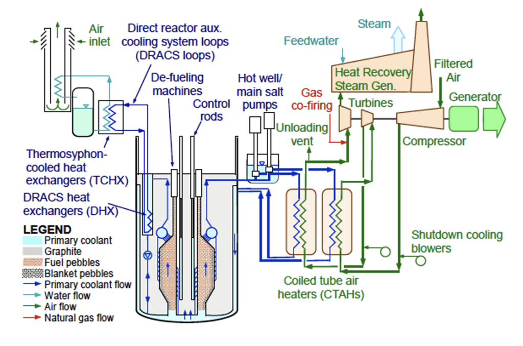 技術の核:Hermes/Hermes 2は、TRISO燃料を詰めた“ペブル”(球状燃料)を炉心に流し込み、溶融フッ化物塩(FLiBe)で冷却するFHR方式です。水と違って低圧で高温まで使えるため配管の負荷が小さく、熱を高温のまま蒸気系に渡しやすいのがポイント。発電側は蒸気ランキンサイクル(蒸気タービン)で、再エネと出力調整で合わせやすい設計思想です。