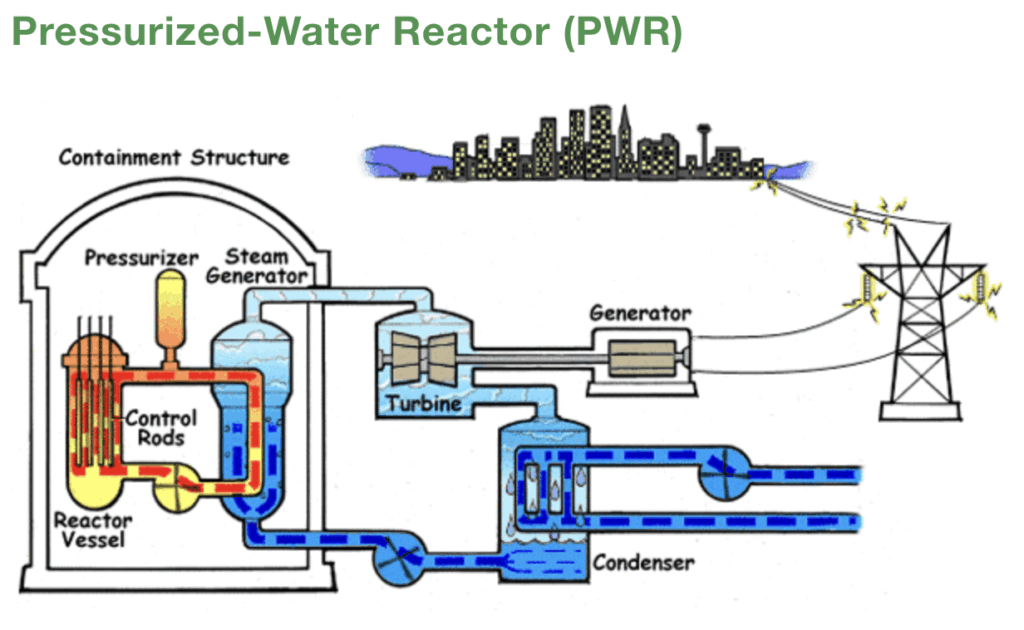 - PWR(加圧水型):炉の水(一次系)を高圧にして沸騰させず循環→蒸気発生器で二次系を沸かす(二重ループ)。タービン側が一次系と分離される。