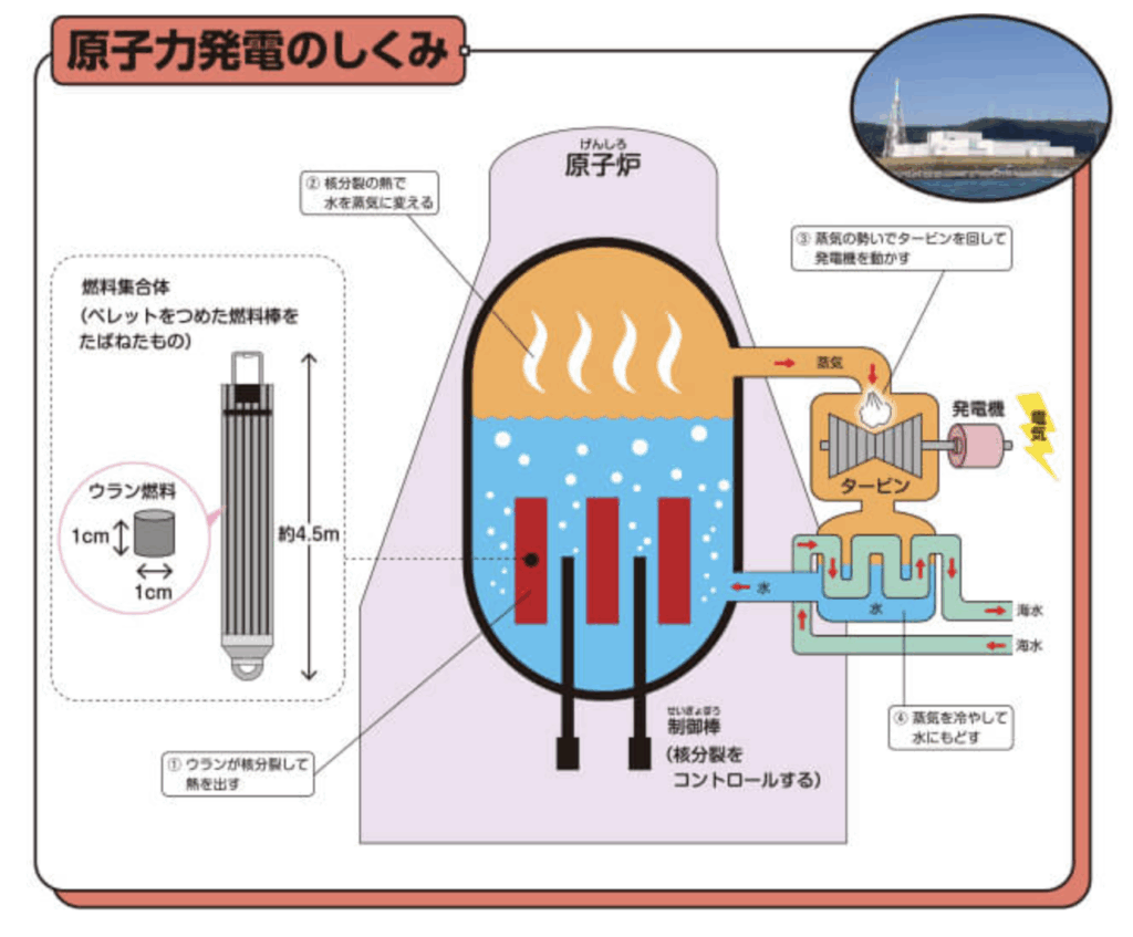 原子力発電は、ウラン燃料が核分裂する時に生まれる熱で水を沸かし、その蒸気でタービンを回して発電機を回す――という、熱機関(蒸気タービン)です。火力発電との違いは“熱の出どころ”が原子炉なことだけ。