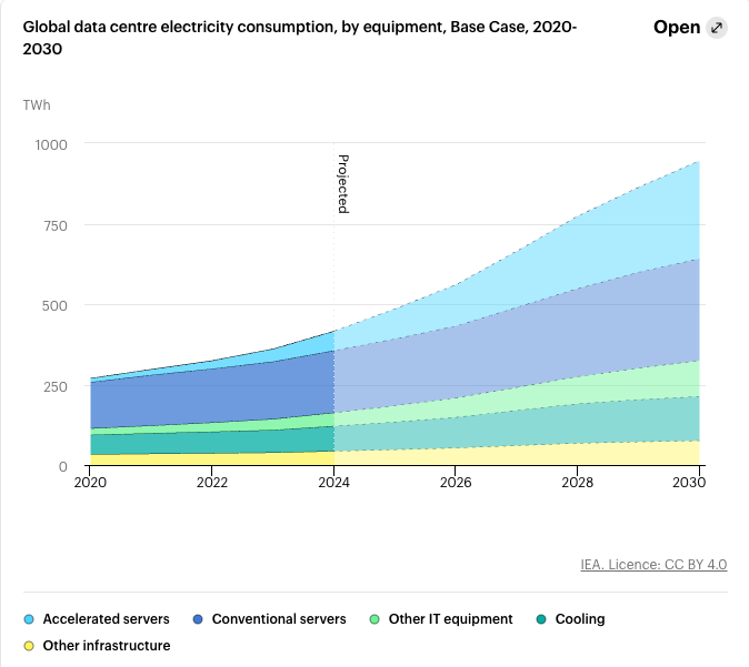 IEAは2030年に世界のDC電力が約945TWhへ倍増と見通しています(2024→2030年CAGR約15%)(出典)。