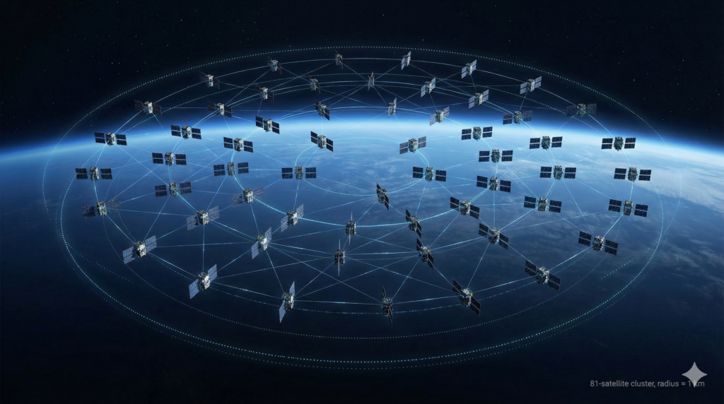 軌道上に配置された81機の小型衛星が光通信で連携し、半径約1kmのクラスター全体で一つの巨大な計算基盤として機能する様子を描いている。