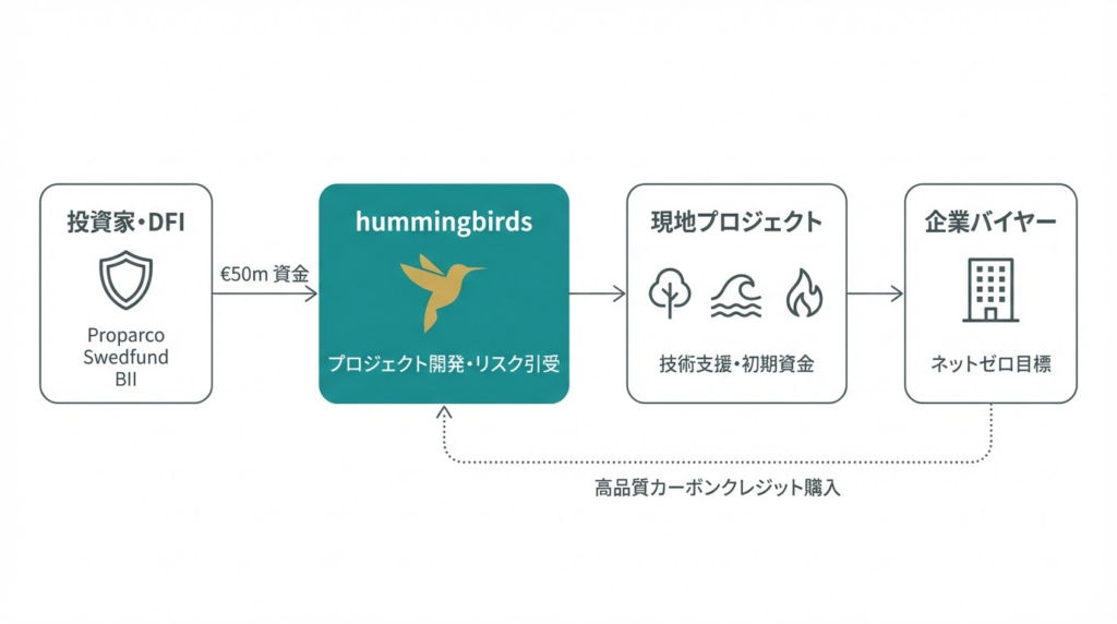 hummingbirdsのモデルはカーボンクレジットの売買を軸としたプロジェクトファイナンス型である。企業がネットゼロ目標達成のためにオフセット需要を持つ場合、hummingbirdsのポートフォリオから長期オフテイク契約でクレジットを購入する形が基本となる。初期段階で同社が開発リスクを負い、クレジット生成後にリターンを回収する構造のため、企業バイヤーにとっては「品質保証済みの高信頼クレジット」を比較的確実に確保できるメリットがある。